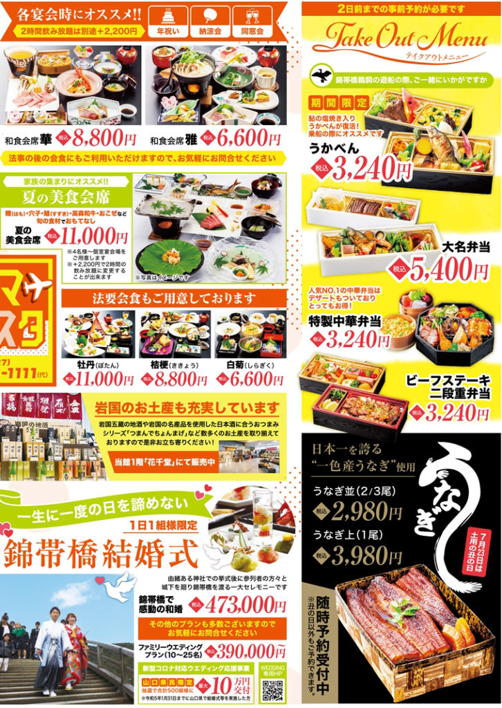 当館をご利用いただいた際はチラシ応募券を切り取って「来店応募抽選会」にもご参加ください♪レストランディナー・ランチペア券、錦帯橋温泉ペア入浴券、岩国地酒飲み比べセットなど豪華賞品が当たるチャンスです!