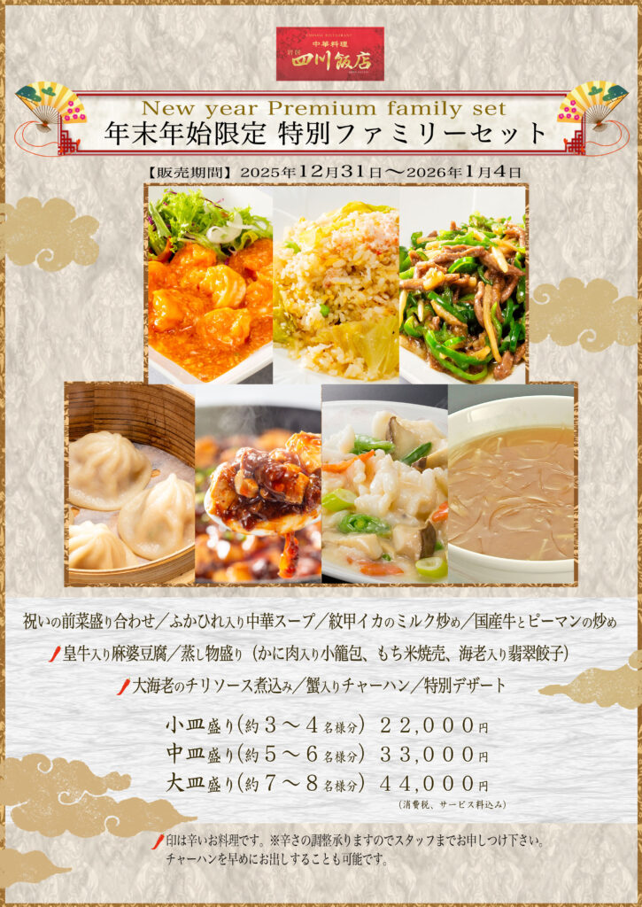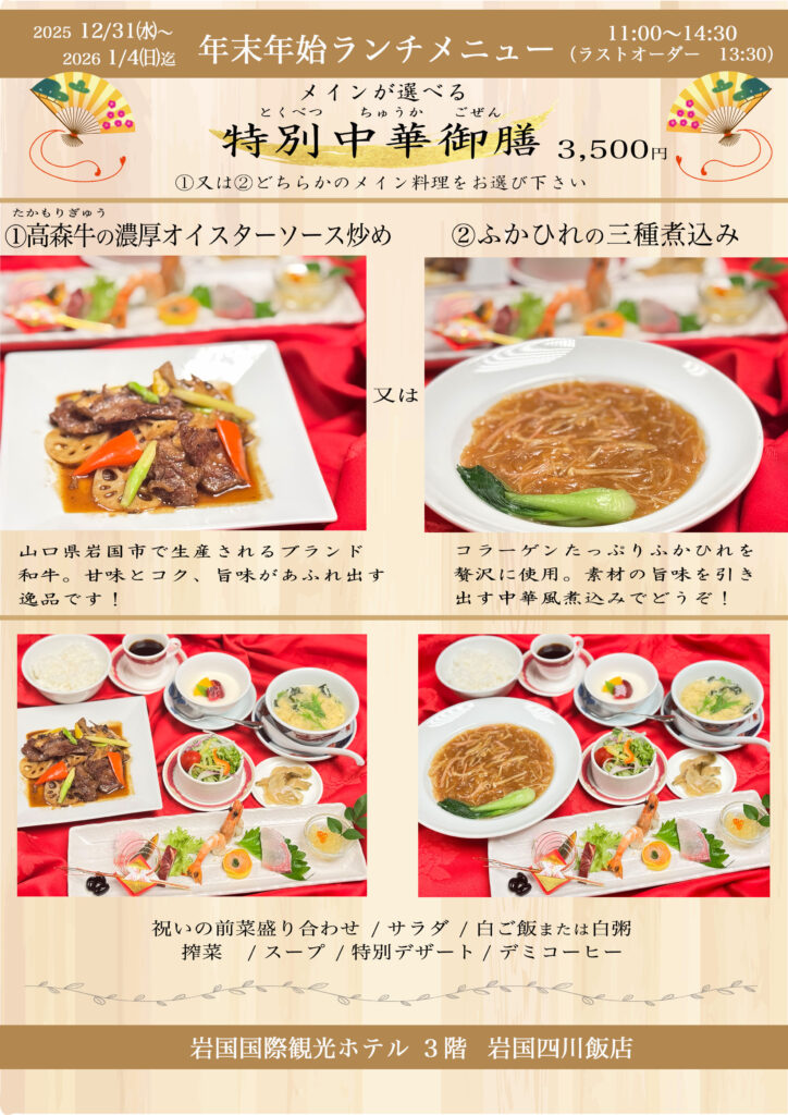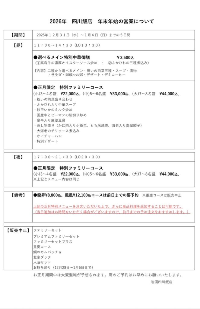 【岩国四川飯店】年末年始の営業について
