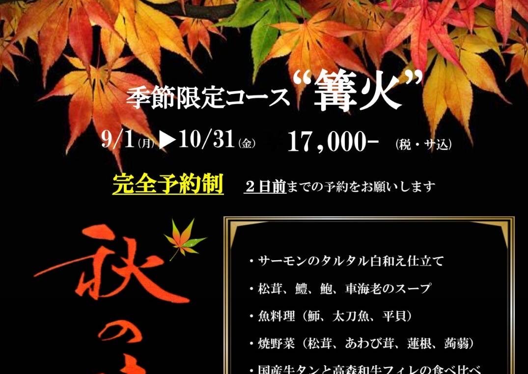 【鉄板焼篝火】2025年 秋の特別コースのご案内